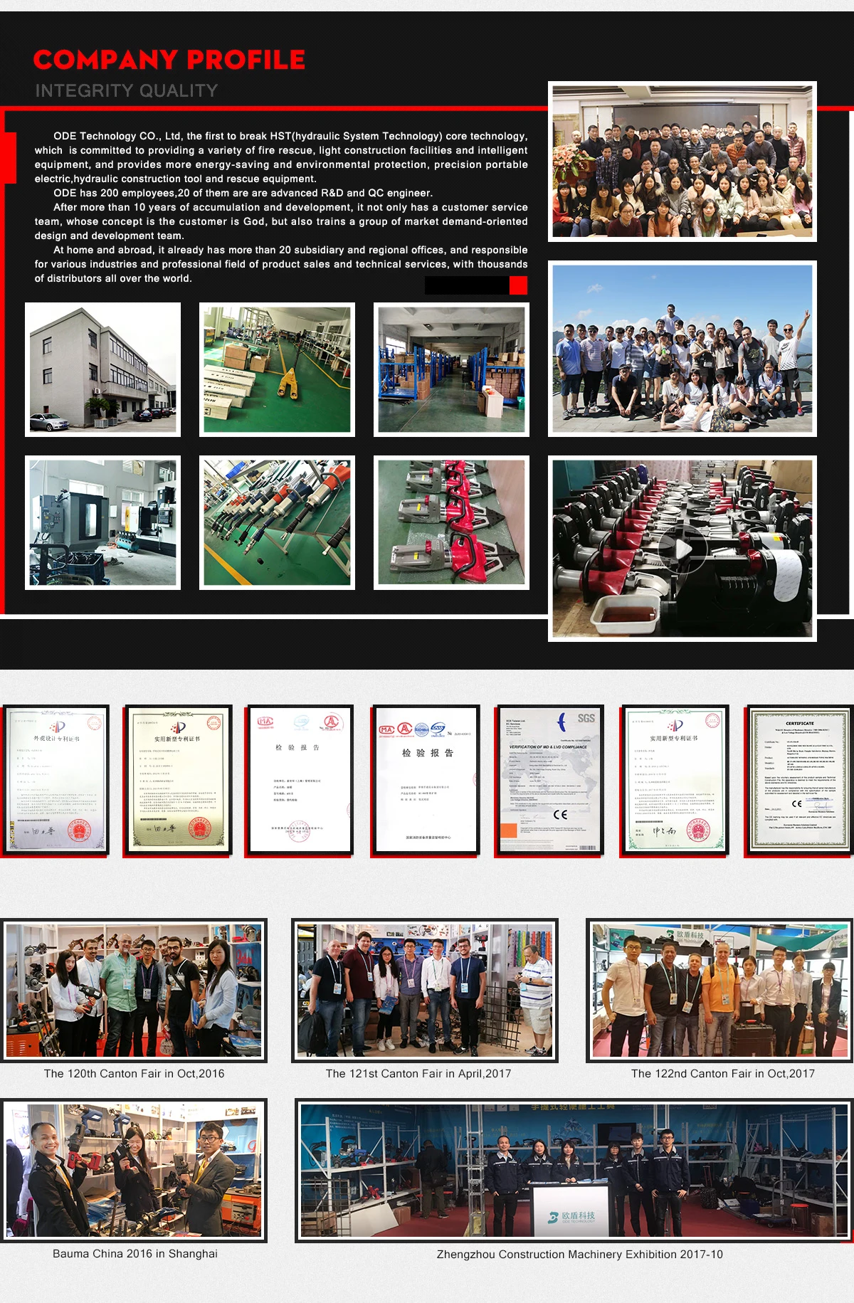 With 200 employees and 2 R&D center. ODE Tecnologia CO Ltd, o primeiro a quebrar o HST (Sistema hidráulico Tecnologia) tecnologia de núcleo, que está empenhada em fornecer uma variedade de salvamento do fogo, luz de construção de instalações e equipamento inteligente, e fornece mais energia-economia de energia e proteção ambiental, precisão elétrica portátil, ferramenta de construção e equipamentos de resgate hidráulico.